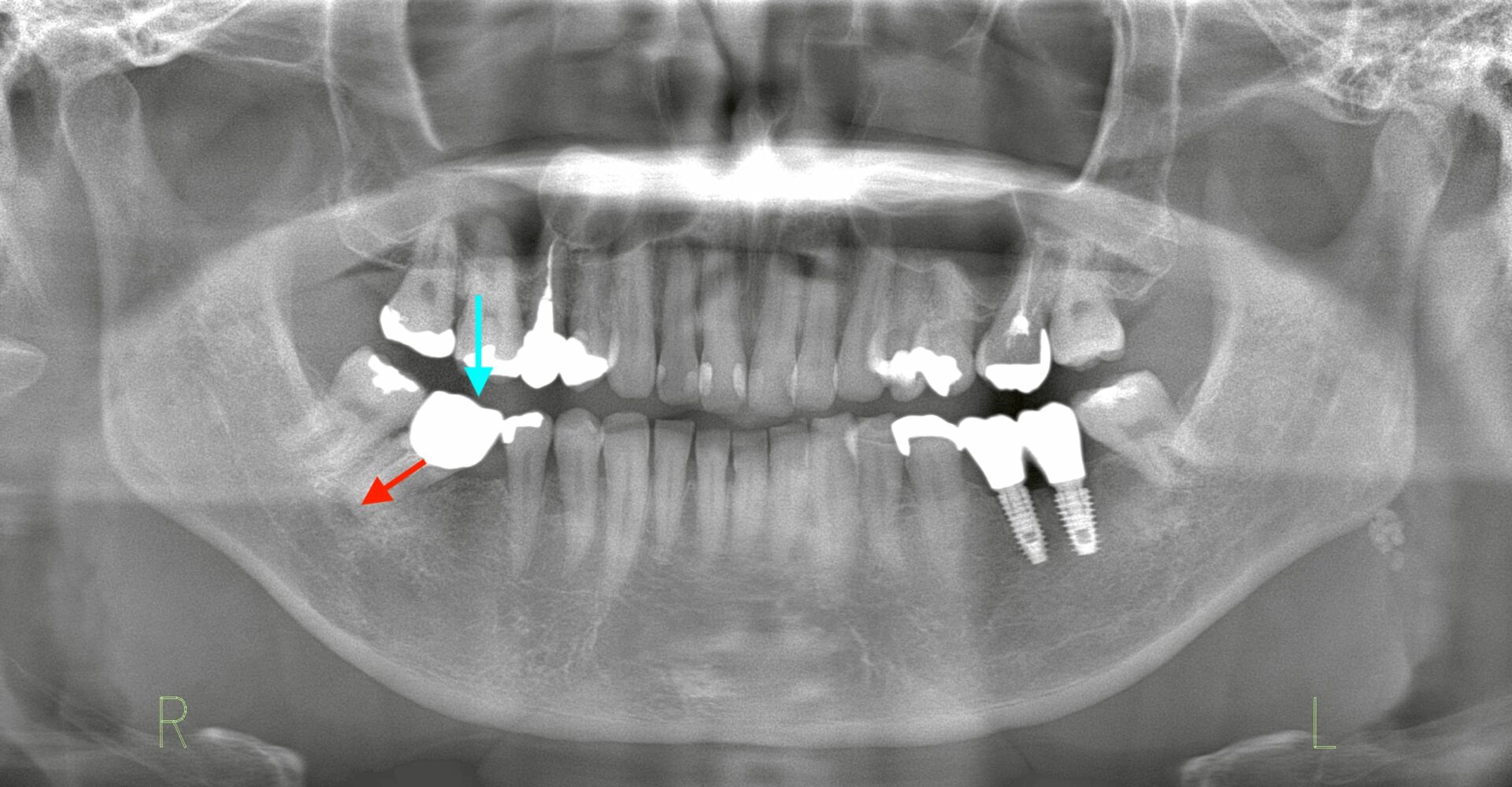 本日は「左下の欠損部における傾斜歯への負担から抜歯に至り、インプラントで再構築した症例」をご紹介します。